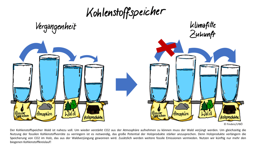 „Bildlich gesprochen, kann man sich mit fossilen Rohstoffen, Wald, Atmosphäre und Holzprodukten vier Wassergläser vorstellen. Das Glas des Waldkohlenstoffspeichers ist mittlerweile randvoll. Es gilt, dieses Gleichgewicht zu bewahren und mit Naturverstand umzufüllen, damit Platz für neues Wachstum entsteht“, beschreibt Verbandspräsident Konrad Mylius die Situation.